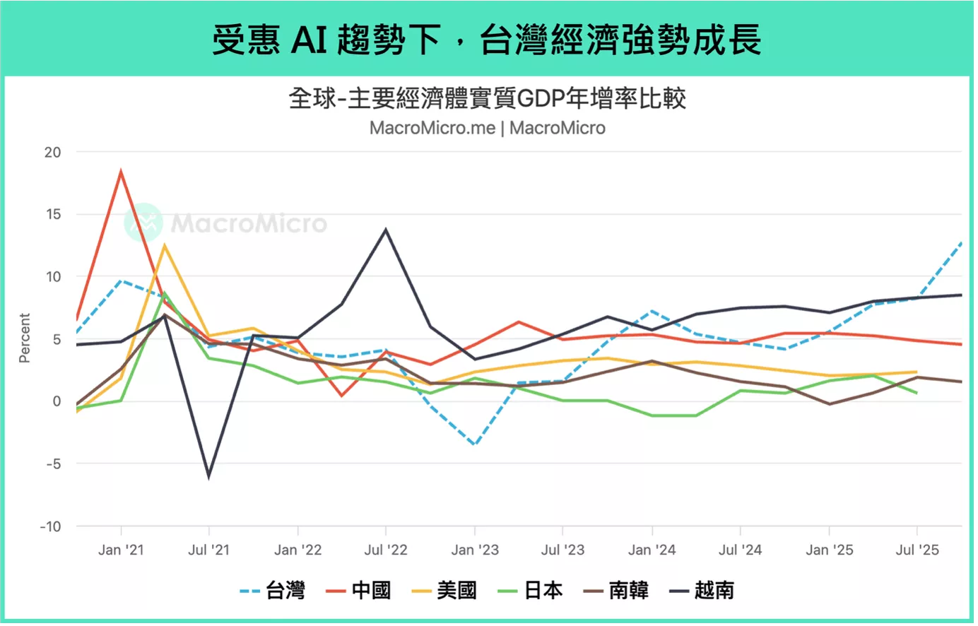 2025年台灣的經濟成長在全球各國中表現突出,亮眼程度傲視群雄。台灣經濟受惠於 AI 與高效能運算需求爆發,2025Q3 GDP 年增率達到 8.21%(前 7.71%),其中出口年增率達到 31.95%(前 36.26%),淨出口貢獻了 GDP 7.5 個百分點,顯著超越其他經濟體,包括同為亞洲四小龍的南韓、日本和香港,Q3 分別成長 1.87%(前 0.62%)、 0.6%(前 2%)、 3.8%(前 3.1%) ,台灣 2025Q4 GDP 年增率預估甚至高達 12.68% (前 8.21%),超越新興市場的越南 8.46%(前 8.25%)。