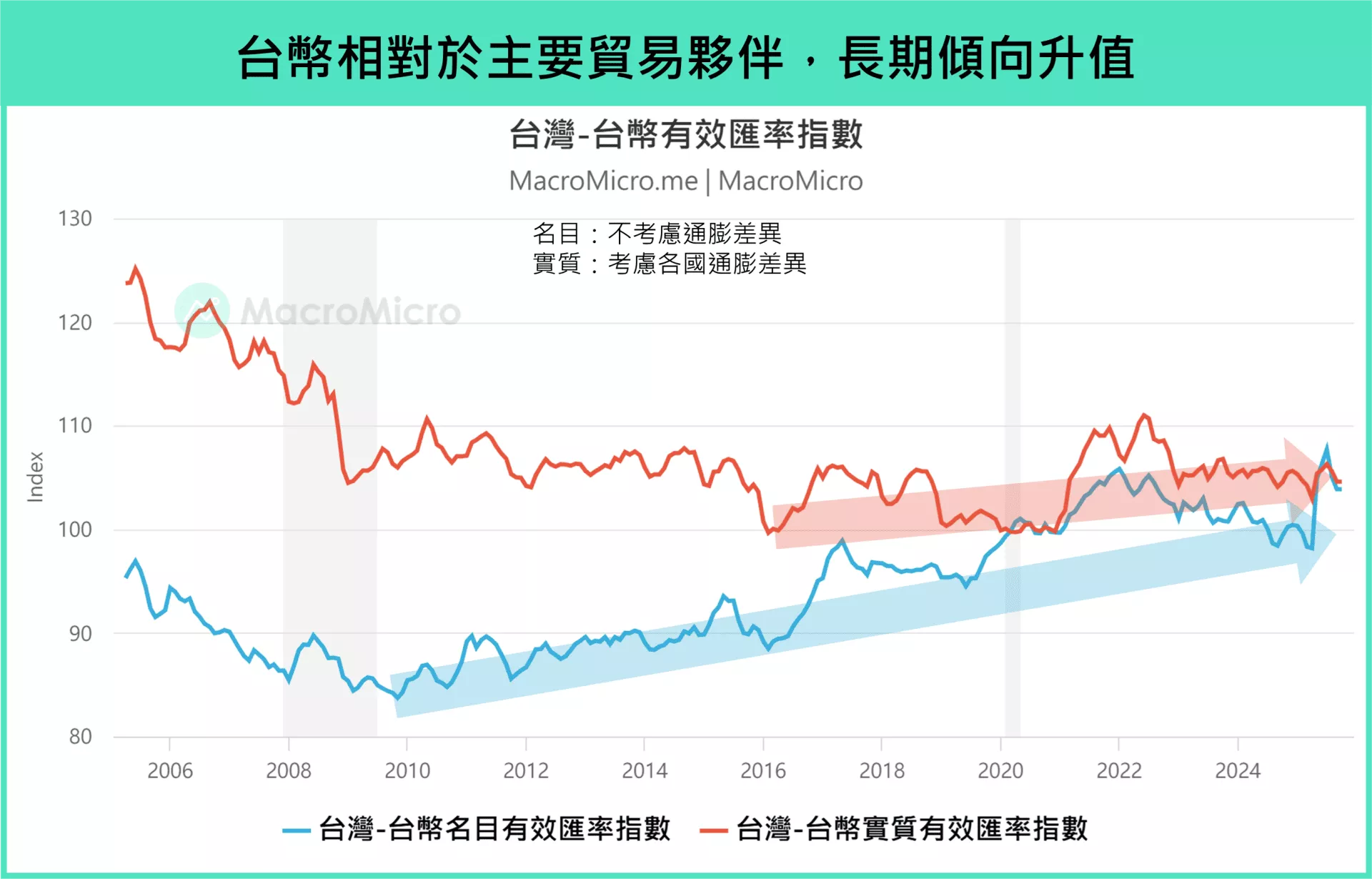 ▲台幣相對於主要貿易夥伴,長期傾向升值。資料來源:財經M平方