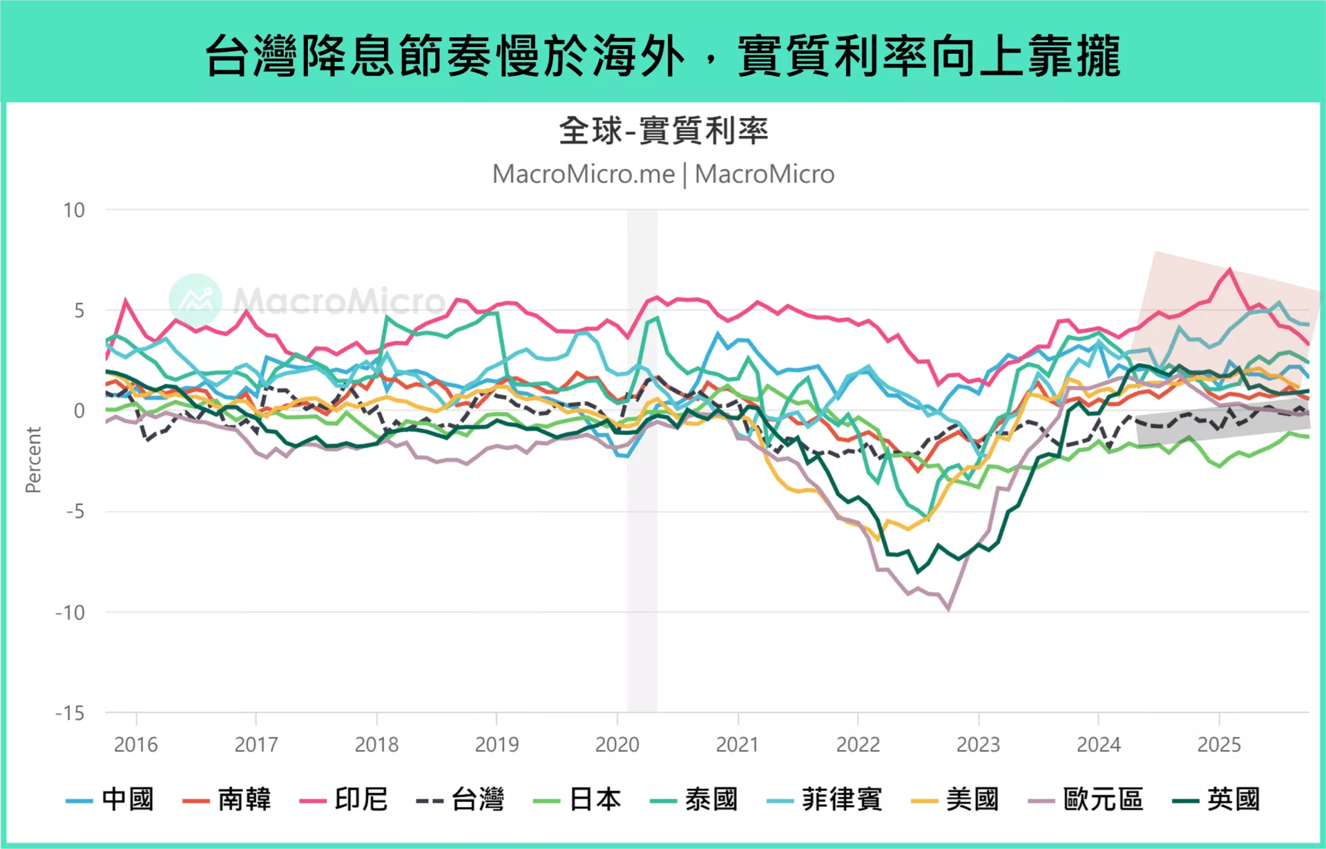 ▲台灣降息節奏慢於海外,實質利率向上靠攏。資料來源:財經M平方