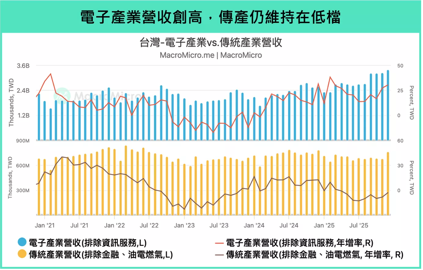 電子出口產業在本波趨勢中獨挑大梁,從電子零組件和資通訊出口來看,兩者增速在去年高基期下繼續維持強勁成長,前者 12 月年增率為 24.1%(前 29.3%),後者年增率 126.3%(前 170.9%)持續維持三位數的成長,帶動 12 月台灣出口金額至 625 億美元,年增率達 43.4%(前 56%),在今年 1 月電子零組件與資通訊單月出口值甚至創歷史新高,年增率分別為 59.8%、129.7%,下圖中,電子產業相關營收也持續創高。