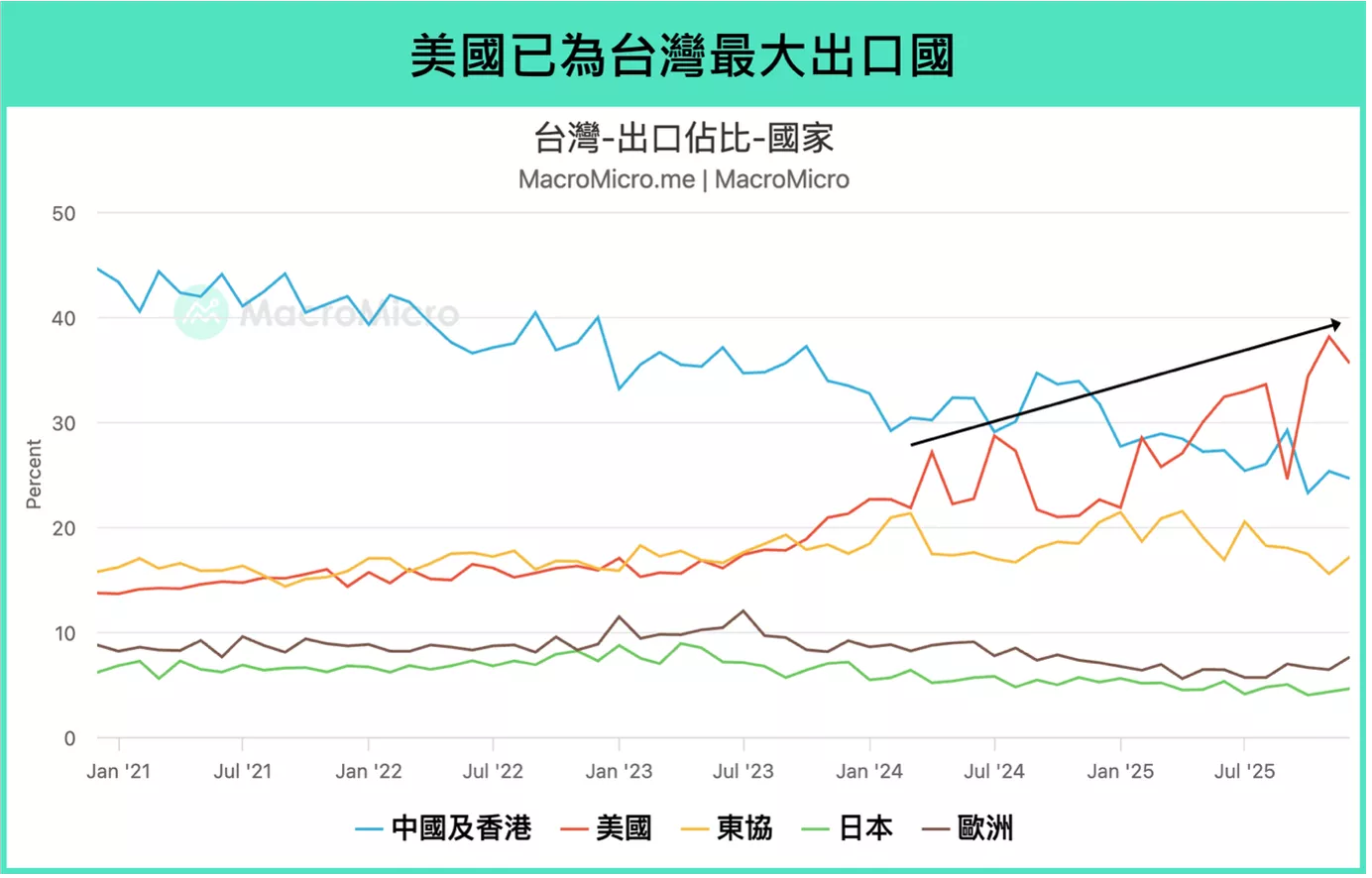 中美科技戰愈演愈烈,雙方都希望各自建立自身的「安全供應鏈」,而台灣作為晶片製造的關鍵節點之一,地位更加凸顯。延續上述,台灣出口之所以有如此亮眼表現,其中很大一部分來自於美國的拉貨動能,去年 12 月 台灣對美出口的佔比 已達 35.6%,為歷史高位,顯示台灣經濟在中美之爭白熱化之下,與美國越發深度綁定,2025台灣核准對外投資金額(不含中國)為 384 億美元,其中美國是這兩年累計投資最多的國家,總計達 193 億美元。