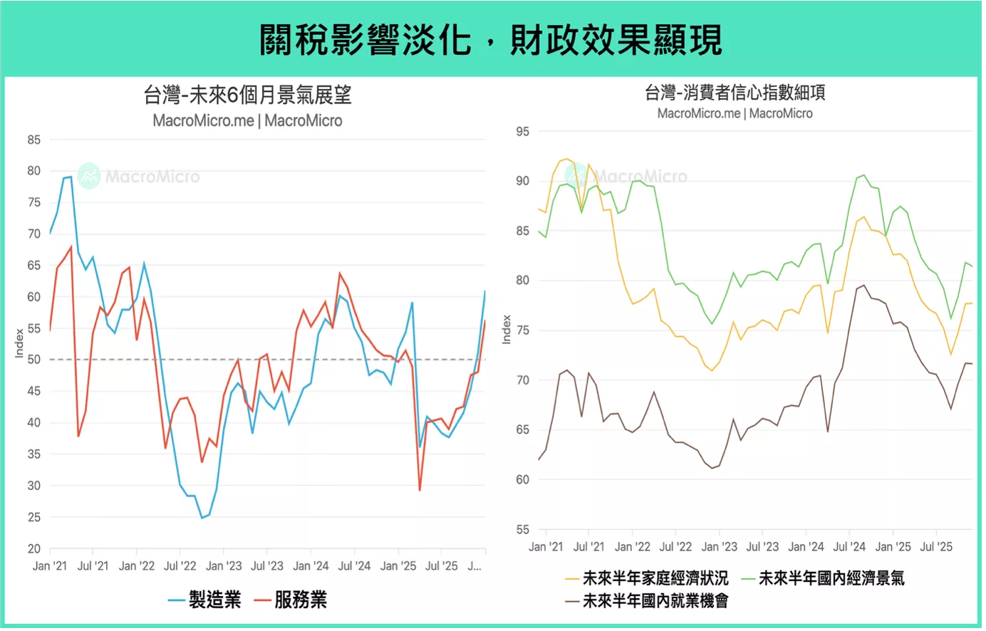 雖傳統產業和民間消費短期的趨勢保守,但部分數據顯示對未來情況轉為樂觀,例如製造業 PMI 和非製造業 PMI 中,對於未來六個月展望 皆同步上升至擴張區間,分別來到 61.0(前 51.0)和 56.3(前 48.0),根據中央大學統計的 消費者信心指數,消費者對於未來的「家庭經濟狀況」、「就業機會」以及「國內景氣」已有所回升。