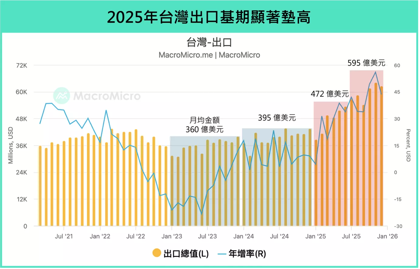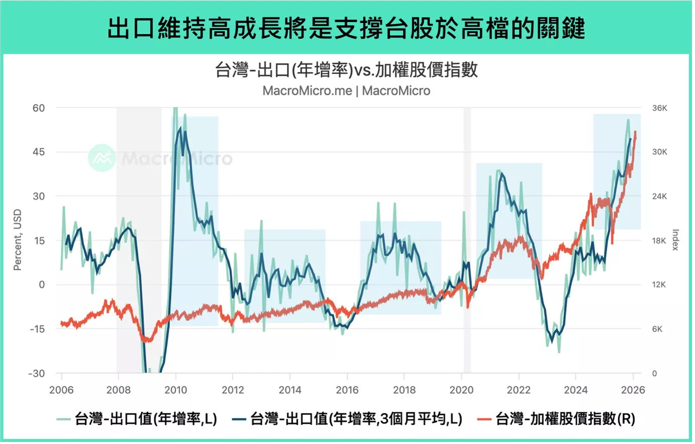 ▲出口維持高成長將是支撐台股於高檔的關鍵。資料來源:財經M平方