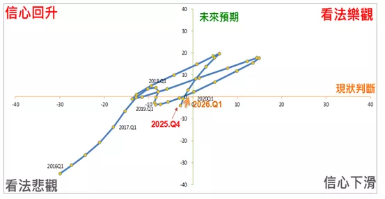 ▲圖一:營建業營業氣候測驗點之景氣循環座落圖。資料來源:台灣經濟研究院,2026年4月